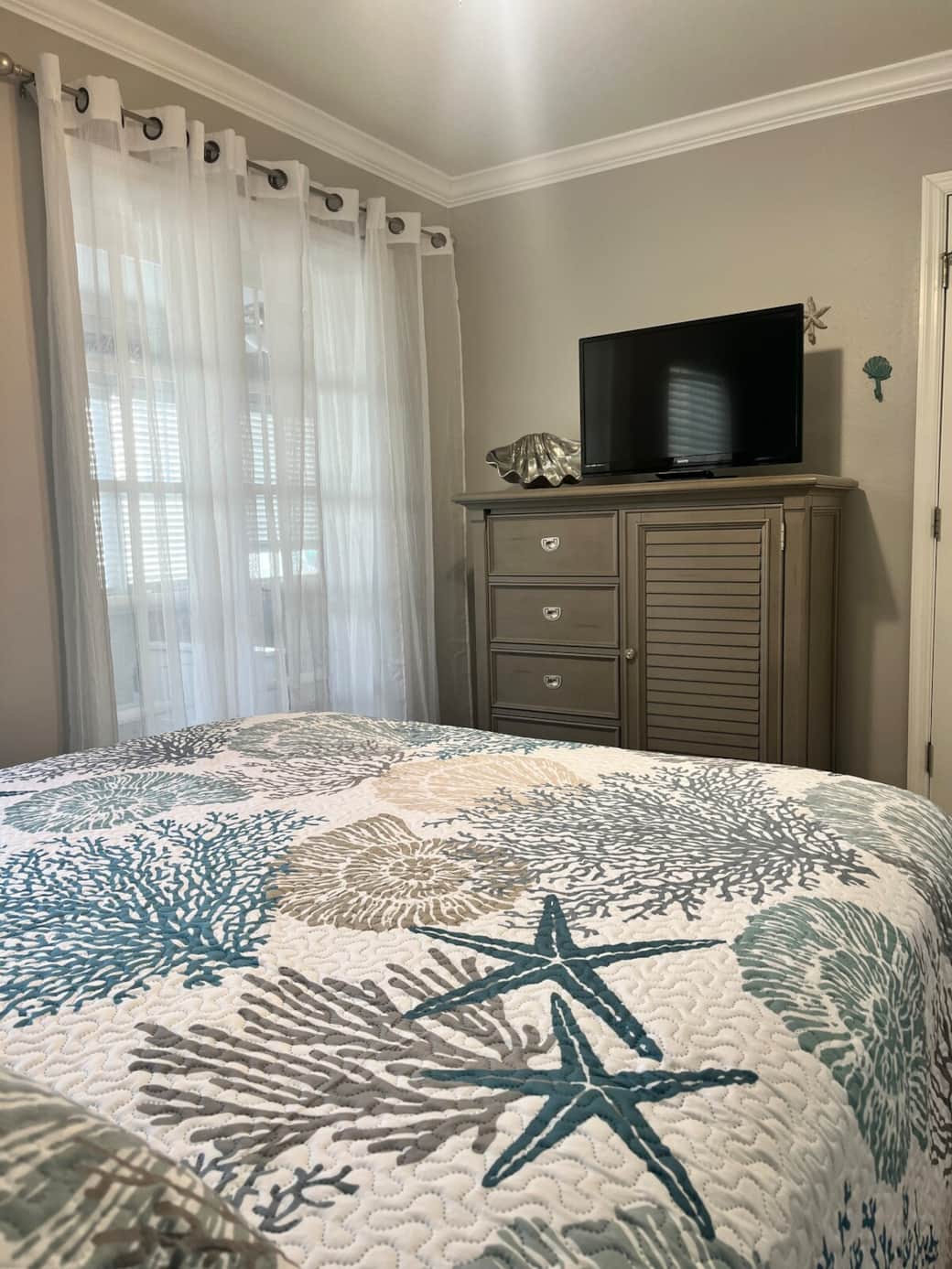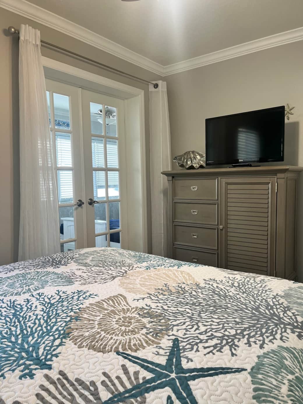 2nd bedroom w Queen size bed and French doors w curtains that leads to Florida room. Generous closet space and dresser